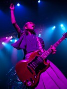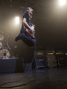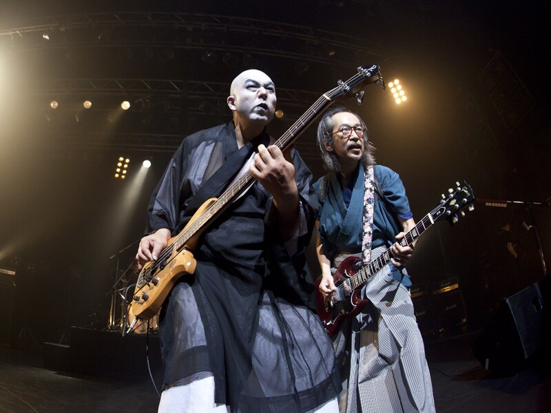 ライブは1曲目「新調きゅらきゅきゅ節」から早くもトップギア。観客は腕を振り上げながら「ぶんがちゃっちゃ」とコールし、会場内は一気に熱気を帯びていく。和嶋慎治(G, Vo)はステージ中を跳ね回りながら卓越したギターソロを弾き、鈴木研一(B, Vo)は威嚇するようにのしのしと妖しく歩きまわりながらベースをプレイ。ナカジマノブ(Dr, Vo)の激しくも安定感のあるドラムに乗せて、重厚なメタルサウンドと力強い歌声がこだまする。この日は25周年記念ということもあり、セットリストは「怪人二十面相」「九相図のスキャット」といった最近あまり演奏されていない楽曲を含む新旧織り交ぜたものに。イントロのフレーズが奏でられるたびに会場には大歓声が沸き起こった。