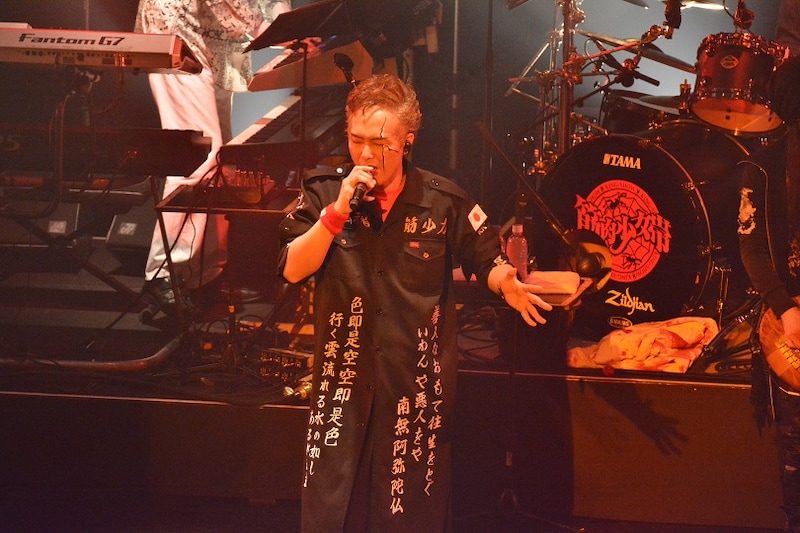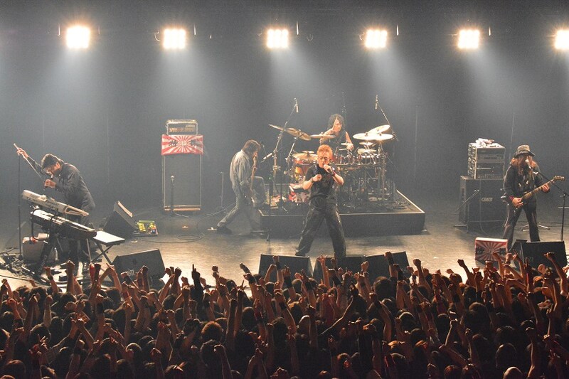 しかしメンバー紹介後にはさっきの言葉もどこ吹く風。大槻が「一番気になるのはオーケンとエディのギャラは倍出るのか?」と語り出したのをきっかけに、大槻と三柴はまるでソリッドでもシンプルでもないトークを展開する。三柴が「2つのバンド分、出るんだよ」「でも申し訳ないから筋少用の衣装を買ったら、2バンド分全部なくなっちゃった」と語れば、大槻は「メガネを新しくしたい」と返すなど、2人は脱線し放題。それでもなぜかARIMATSUからOKをもらうと大槻はNARASAKI(G)が着ていたダッフルコートを「暑くない?」と、サポートメンバーRIKIJI(B / OBLIVION DUST)のタトゥをARIMATSUともども「スーパー銭湯に入れない組」とイジったのち「特撮はサクサクいっちゃうぜ! でも曲はズンズン重いぜ!」とシャウトし“ズンズン重い”ナンバーを4連発する。「5年後の世界」ではステージ最前列に踊り出したRIKIJIが両手でメロイックサインを作り、超満員のフロアを挑発。「林檎もぎれビーム!」ではそのフロアが大槻とともに「あいつらにだ!」コールをBLITZいっぱいに響かせた。