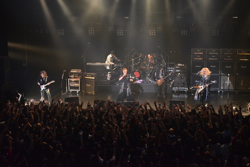 途中、楽器を降ろした橘高、本城、内田と大槻がステップを踏みながらマイクリレーを披露した同曲のあとには、橘高がネックを握ってフライングVを振り回し、三柴が放心したかのようにイスに座り込む、どちらも“らしい”パフォーマンスとともに「これでいいのだ」をプレイ。「この際、特撮のタオルでもいいぞ! BABYMETALのタオルでもいいぞ!」と大槻に煽られたオーディエンスがタオルを振り回しながら「これでいいのだ」を大合唱したところで、この日のBLITZのボルテージは何度目かのピークに引き上げられた。