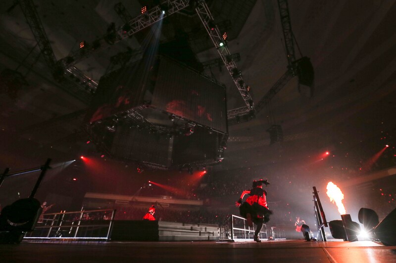 Dream Theaterのライブアルバム「Live At Budokan」が流れる中、定刻が少し過ぎた頃に会場が暗転。前日の公演とは異なるナレーションと映像がスクリーンに上映され、BABYMETALのこれまでの活動を振り返りつつ「残された時間は……あと……わずか」と告げられる。するとスタンド席の一角に用意された階段から、赤い剣を持ったBABYMETALの3人が登場。3人が階段をゆっくり下りアリーナに設置されたセンターステージの中央に立つと、ライブは「BABYMETAL DEATH」から勢いよくスタートした。アリーナでは早くもサークルモッシュが発生するほど熱い盛り上がりを見せ、続く「いいね!」ではレーザー光線が飛び交う中「いいね!」コールで会場が一体となった。