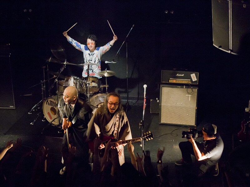 今回の撮影では「なまはげ」が計4回演奏されたため、初披露された新曲だったにも関わらずファンもすっかり曲を覚え、和嶋慎治(G, Vo)が「普段のライブより汗かくな」とメガネを曇らせながら語るほど会場の空気は熱気を帯びたものに。MCでは、筋肉少女帯と対バンした際にそのステージに感銘を受けた和嶋が、その面白さを自分も取り入れようとして一輪車を買ったというエピソードや、鈴木研一(Vo, B)がグルコサミンを愛飲している話などが語られ、そのたびに会場は爆笑で包まれていた。