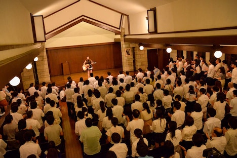 国の重要文化財にも指定された、歴史を感じさせる会場にはドレスコードに設定された制服や白いシャツを着用した約250名の観客が集結した。通常のライブとは異なりどこか厳粛な空気が漂う中、片平はシーンと静まり返った会場に何の前触れもなく登場。片平は床に予備のピックを1枚置き、そのまま抱えていたアコースティックギターをつま弾きながら、デビュー曲「夏の夜」からライブをスタートさせた。観客はスピーカーを使わない、ダイレクトに響く歌声とギターの音色に静かに耳を傾ける。ときに囁くように、ときに力強くと緩急を付けて熱唱する片平は、1曲歌い終えると「こんにちは。片平里菜です。不思議な雰囲気ですね」と笑顔で挨拶。いつもより若干静かに振る舞う観客に対し、彼女は「ちょっと緊張してます?(笑) 私もちょっと緊張してます」は微笑んでみせ、「一緒に、いい夜にしましょう」と最初のMCを締めくくる。