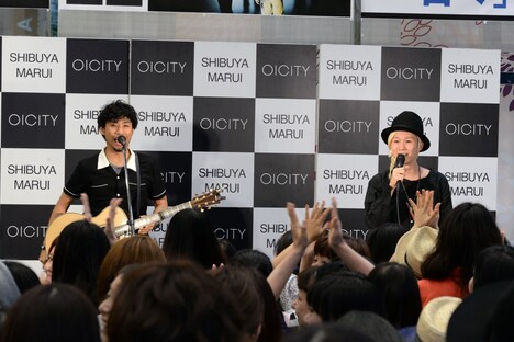 17:00からと19:00からの2回行われたこのイベントには、各回500人もの観客や買い物客が集まり、吉田山田のアコースティックライブを堪能した。小雨が降る中スタートした1回目の公演は、「魔法のような」から元気よくスタート。山田義孝(Vo)が手拍子で煽ると、観客はそれに合わせて手拍子を始める。さらに山田のコール&レスポンスにも歌声で応えるなど、会場はオープニングから大きな盛り上がりを見せた。