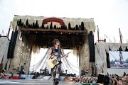 天気予報では雨だった2日目だったが、メンバーや観客の願いが通じたのか、ライブ前には美しい夕焼けがステージの後方に広がるほどの好天に。オーディエンスの興奮感が会場に漂う中開演時刻の17:30を迎えると、HYDE(Vo, G)とK.A.Z(G)がバンドメンバーを引き連れバギーに乗って客席エリアに登場。「BEAST PARTY」恒例とも言えるオープニングの演出でオーディエンスを歓迎する。その後、HYDEのみを残してK.A.Zを含むメンバーはステージへ移動。K.A.Zの切れ味の鋭いカッティングがイントロを飾る「LOVE ADDICT」で、ライブの口火を切った。ステージから伸びる花道に足を踏み入れたHYDEは、「Hello bloodsuckers! 悔いを残すなよ」と挑発し、客席エリアに熱狂の渦を作り出していった。さらにバンドは火炎の演出が禍々しい曲の世界を視覚的に表現した「REDRUM」、HYDEが客席に向けて放水銃を放ち、観客の興奮を煽った「TROUBLE」とエネルギッシュなナンバーを連投した。