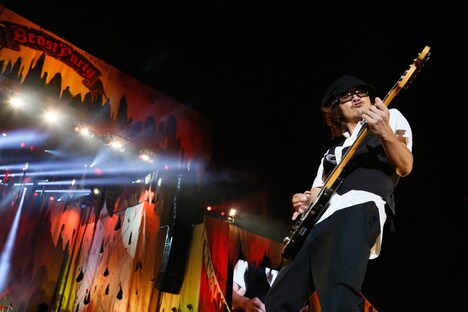 「この日のことを忘れないように」という願いを込めて演奏された「MEMORIES」を経て、ライブはいよいよ終盤戦へ。K.A.Zが豪快なギターリフを奏でる「REVOLUTION II」では、曲の途中でファンの呼びかけでスペシャルゲストのkenが登場。VAMPSのフラッグをはためかせて現れた彼は、肩にかけたVAMPSのトートバッグからアンパンマンなどのキャラクターをプリントしたキャップをメンバーに配って回り、観客を笑わせる。HYDEが「仲間が増えたところで、お前ら実力見せてくれ!」と叫ぶと、会場内の観客の熱狂はどんどん加速した。kenはHYDEの下半身をタッチしたり、絡んでみせたりと相変わらずの自由奔放なアクションでVAMPSの面々を翻弄。負けじとHYDEがkenの股の下を潜りながら熱唱すると、お祭り騒ぎに拍車がかかった。「お願いしたら断る気ゼロみたい。当たり前のように来ていただけまして」と紹介されたkenは、そのあとに披露されたL'Arc-en-Cielの「HONEY」と「Shout at the Devil」にも参加。kenはステージをくまなく歩き回りながらVAMPSのメンバーとコミュニケーションを計りつつ、勢いよくギターをかき鳴らす。kenが去ったあとは、「最後にみんなではっちゃけようぜ!」というHYDEの言葉からラストナンバーとして「SEX BLOOD ROCK N' ROLL」が届けられた。高らかに響くシャウトと、激しく勢いのあるバンドサウンドが夜空に響きわたる。そして、HYDEの「もうひと仕事したら戻ってくるから。首洗って待ってろ!」という宣言をもって「BEAST PARTY」は華々しくフィナーレを迎えた。