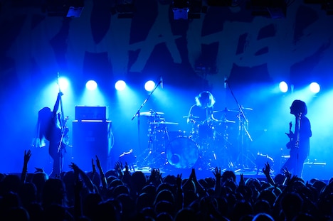 途中、345による恒例のグッズ紹介では、オリジナルの手ぬぐいに描かれたイラストが345の夢の中に出てきた架空の青い鳥であることなどが明かされた。観客が「かわいい!」とグッズに対して反応すると、345は「かわいいですよね、じゃあ、ぜひぜひお買い求めください!」と巧みな営業トークで会場を沸かせた。さらに10月3日に同会場で行われるワンマンライブの告知をはさみ、ライブは後半戦に突入。グランジテイスト全開の荒々しいリフが印象的な「Jesus wa gokigen naname」ではmomoがシャウトし、345が激しく頭を振る。さらにアウトロではyukihiroがバスドラを高速で連打するなど、バンドの攻撃的な一面をのぞかせた。MCでmomoはムックについて「2012年の年末に日本武道館でやったイベントのとき、楽屋が一緒でしたね」と思い出を語る。さらに「あの日はyukihiroー! 345ー!ってお客さんが名前呼んでましたけど、僕だけ『ギターの人ー!』って言われてましたね(笑)」とその日のライブでのエピソードを振り返ったのち、3人はラストに代表曲「hitsuji」を届けてステージをあとにした。