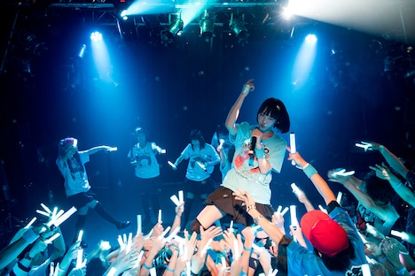 2番手はグッバイフジヤマが登場。ダンサブルなロックサウンドに合わせて観客も体を揺らす。2曲目「レノンとマッカートニー」が終わると、あのをステージに呼び込み、ギターの小島“lue”秀和が彼女にプレゼントを渡した。そのまま9月10日に発売されるニューシングル「ひばりくんの憂鬱」を彼女とコラボ。楽曲中盤の“落ちサビ”をあのが歌うと、客席ではケチャが巻き起こった。