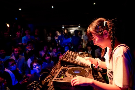 続いて登場したのはDJ younaP!ことゆるめるモ!・ようなぴ。ゆるめるモ!メンバーの中では唯一DJ経験がある彼女だけに、手慣れたプレイで会場を盛り上げる。自身のソロ楽曲も歌い、熱気で充満する会場をキラキラした雰囲気に包んだ。