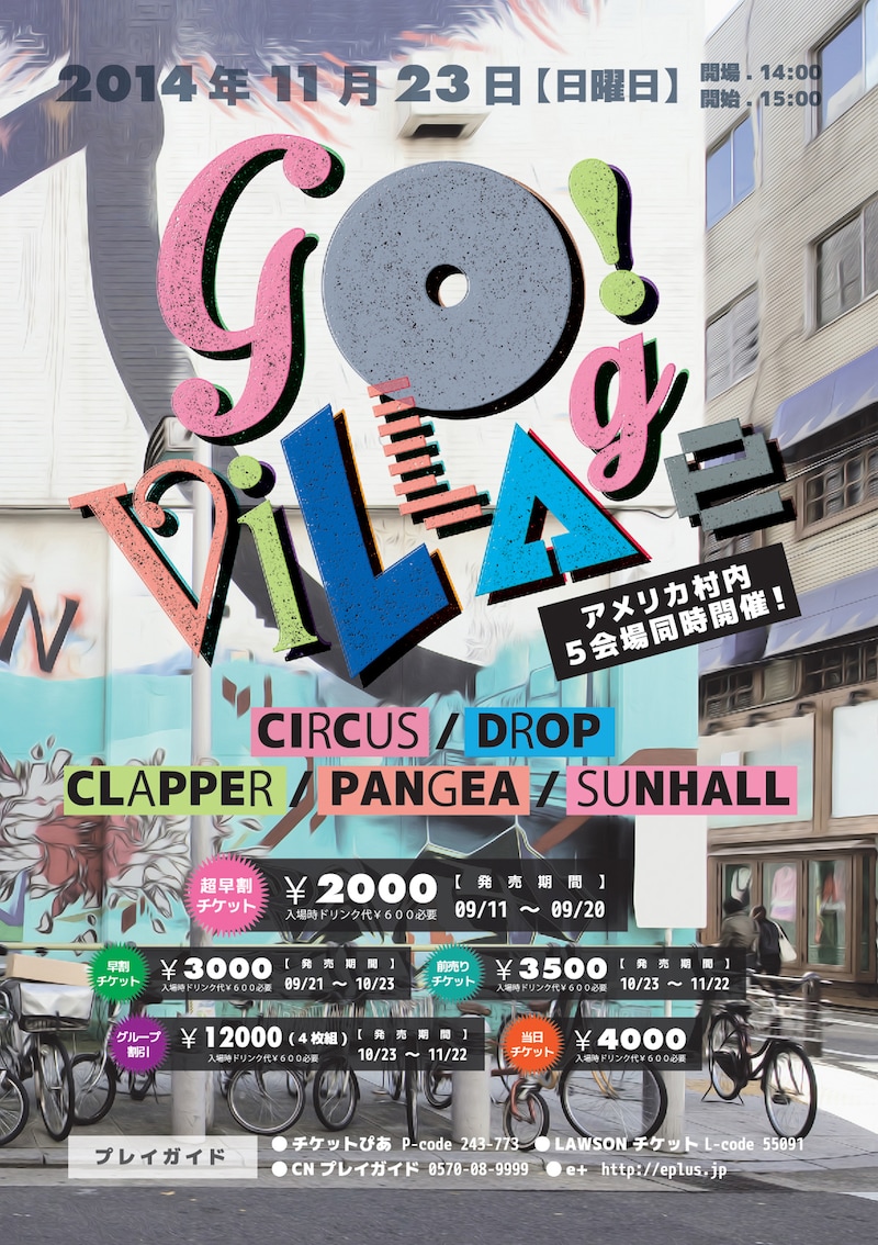 「Go! Village」は大阪・アメリカ村内のCLUB CIRCUS、心斎橋CLUB DROP、CLAPPER、LIVE HOUSE Pangea、SUNHALLの5会場で実施されるサーキット型イベント。チケットは10月22日まで早割券、23日から前売券とグループ割引券が販売される。