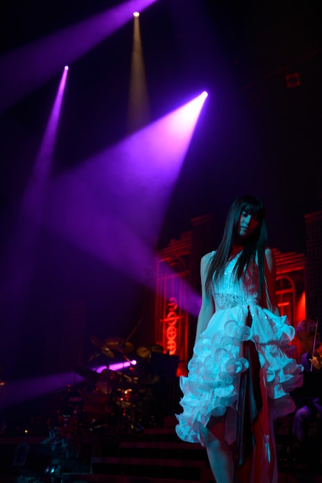 しかし彼女が「次はダークな曲を」と宣言したのちには、ドラムとピアノの不穏なループに、低音のみで構成されたチェロの旋律とノイジーなギターソロが絡み合う「うつくしさ」や、そのアウトロで圧巻のポリフォニーをホールいっぱいに響かせた「red moon」というシリアスなナンバーをドロップ。さらにコーラスワークだけでなくダンスでも魅せる「Magia [quattro]」と、情熱的なアッパーチューン「to the beginning」で畳みかけた3人は、アブストラクトな電子音とサンプリングされた彼女たちの歌声で構成された「interlude」が鳴り響く中、キーボーディスト櫻田泰啓とストリングス隊を残してバンドメンバーとともに一旦退場。その曲中にステージ下手に設置されたグランドピアノを櫻田が奏で出すと、黒のドレスに文字通りお色直ししてステージに再び現れ、彼らのプレイをバックに、いずれも雪をモチーフにしたバラード「seventh heaven」「snow falling」を、息づかいまでもが聞こえてきそうな静かで優しげなコーラスワークで歌い上げた。