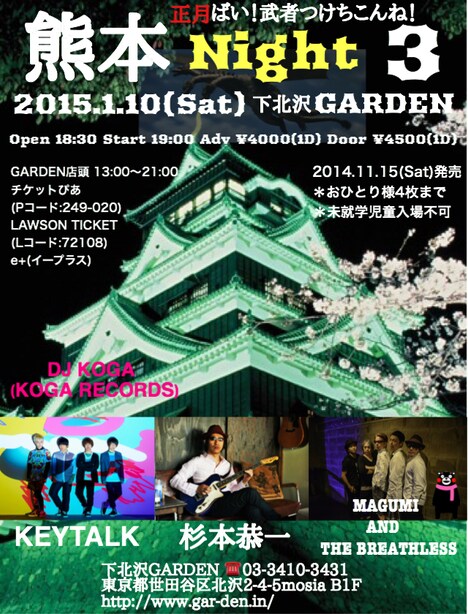 MAGUMIはこのイベントを「武者返しも登りきる勢いのKEYTALK!火の国もっこす杉本恭一!つい首都を熊本と勘違いしてしまうTHE BREATHLESS!下北沢をエラで風切るDJ KOGA!熊本のスーパースターが集まる新年一発目(笑)」と自身のTwitterで紹介。火の国・熊本出身者たちがアツいライブを繰り広げてくれることは間違いなさそうだ。