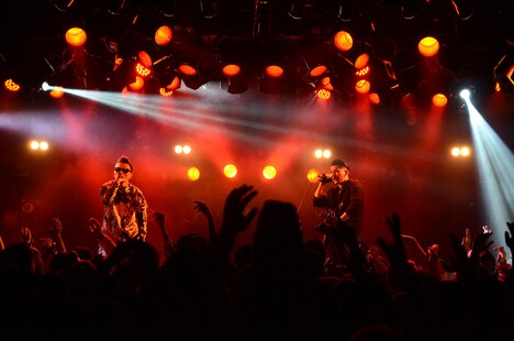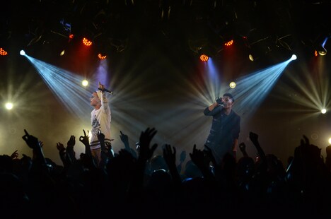 AKLOは、ダンサーもDJも付けず何もないシンプルなステージに現れると、アルバムでも冒頭を飾る「The Arrival」をまずお見舞い。続いてリードチューンの1つ「Break The Records」を送り、「俺のライブは自由に楽しんでもらいたい。そうは言ってもね、この曲はさすがにブチ上がるしかないぜ!」と「RGTO」を繰り出した。この曲でコラボしたSALU、K DUB SHINEが曲中にステージへ入っていくとそのたび大歓声で迎えられ、“2014年のヒップホップアンセム”と言うにふさわしいコール&レスポンスがステージとフロアを行き交った。