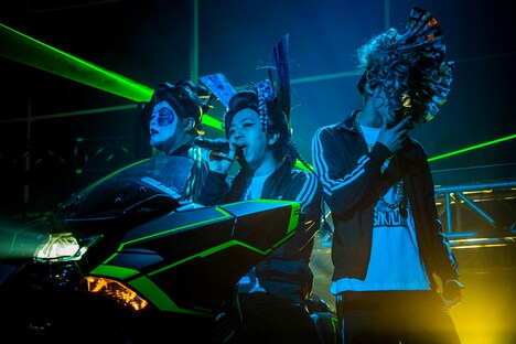 アンコールでは3人が「すまいる」「ミュージックドリーマー」とアッパーチューンを連発すると、会場はお祭り騒ぎの盛り上がりを見せる。そしてラストナンバー「ららら★フェスティバル」では大所帯のキッズダンサーも登場して、ハッピーな雰囲気に包まれた。ダブルアンコールでメンバーは同曲のPVで使用したHondaの大型バイク「NM4-01」とともに登場。レーザーが飛び交うクールな演出の中でキャッチーなEDMチューン「SAMURIDER」を披露してライブを締めくくった。