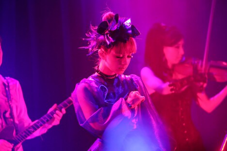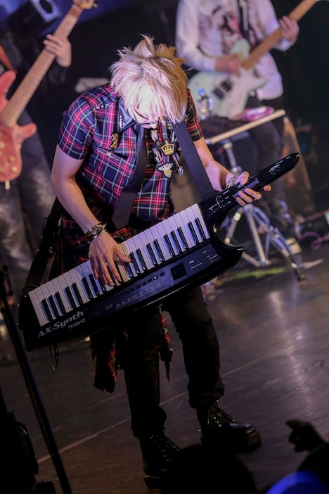 1曲目「PRIDE」の演奏スタートとともにステージが明転すると、赤を基調としたタータンチェックの衣装に身を包んだメイリア(Vo)がダンサー2人を従えて登場。彼女はバンドの演奏に合わせてキレのあるハードなダンスを披露し、会場のテンションを一気に引き上げていく。続く「grilletto」では、彼女が拳を突き上げながら「いくぞリキッド!」とオーディエンスをアジテート。彼女の言葉に呼応するように、観客たちは曲に合わせてサイリウムや拳を振り上げた。「ここをクラブGARNiDELiAに変えましょう」というメイリアのひと言からダンスナンバー「Steps」が始まると、toku(Key, Compose)はオーディエンスを先導するように手を上げてジャンプ。ライブ序盤から一体感のあるステージが展開された。