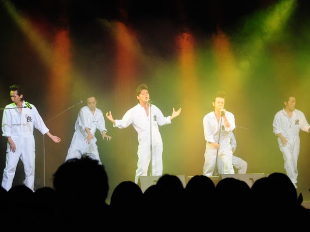 イベントはまず、エアバンドが登場し「青春 俺」を披露。人気番組「クイズ!ヘキサゴンII」から生まれたユニット・エアバンドは、山根良顕(B/アンガールズ)、波田陽区(Dr)、岡田圭右(Vo/ますだおかだ)、庄司智春(Vo/品川庄司)、金剛地武志(G/yes, mama ok?)、田中卓志(Key/アンガールズ)の6人組。“エア”ながらも迫力あるパフォーマンスで、会場を沸かせた。