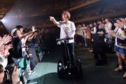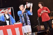 幻想的な空気が紡がれた「結晶星」が終わると、再びMCへ。普段通りのゆるいトークが展開されると思いきや、谷口は「武道館でやることも夢だったので、バンドとしての夢がまた1つ叶いました。でもKANA-BOONはこのままでは満足しないということでメンバー1人ひとりの夢を叶えていこうと思うわけですが……」と焦らすように語り、「今日はすごいものを用意してます! 鮪の解体ショーをしたいと思います!」とうれしそうに叫び料理人を呼び込む。予想外の演出に驚く観客の前で粛々と鮪の解体が進められ、谷口は最後に中落ちを賞味。「めちゃくちゃうまい!」と満面の笑みを浮かべて観客を和ませた。メンバーの夢を叶えるコーナーはそのあとも続き、今度は飯田が「セグウェイで大好きなお客さんの間を走りたかった」とセグウェイでアリーナエリアを疾走。ステージに帰還した彼は「超気持ちいい。最高やわ。今度セグウェイライブしよう」という提案でメンバーを苦笑させていた。