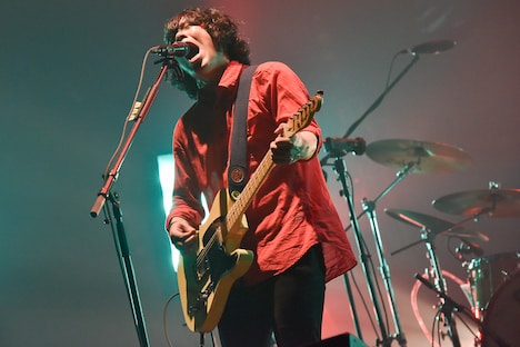 場内の暗転とともにステージを覆っていた白い幕に時計の映像が投影され、時計の針が「12」を指した瞬間に小泉貴裕(Dr)の豪快なドラムが炸裂。幕が落ちると同時に谷口鮪(Vo, G)が「武道館!」と叫び、ライブの始まりを告げた。オープニングナンバーは最新アルバム「TIME」の1曲目を飾る「タイムアウト」。性急なビートとまくしたてるような谷口のボーカル、古賀隼斗(G)の鋭利なギターが一体となり会場を飲み込んでいく。「今日は1日楽しんでいきましょう」という谷口の短い挨拶を経て、ライブの鉄板曲「ウォーリーヒーロー」や「ターミナル」が披露されるとオーディエンスが放つ熱気は上昇していく。
