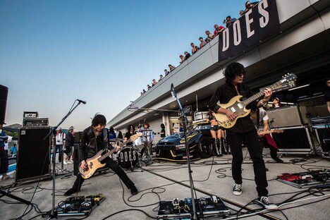 DOESは「SUPER GT」のGT300クラスに参戦中のチーム・RUN UP SPORTSのために新曲「ランノヴァ」を書き下ろしており、今回はメンバーの「レースの会場でライブをやってみたい!」という思いから富士スピードウェイでのライブが実現した。3人はまず、バンドの名刺代わりとも言える「曇天」を届け、さらに「バクチ・ダンサー」でオーディエンスの熱狂を煽る。さらに「すべての『SUPER GT』ファンに捧げる」という紹介から、新曲「ランノヴァ」をパフォーマンスした。この曲は氏原ワタル(Vo, G)が今年の3月に「SUPER GT」を観戦したことを受けて制作した、DOESが得意とする勢いのあるコード進行やビート感がレースとマッチしたナンバー。レース場にはDOESが鳴らす爆音のロックチューンが響きわたった。
