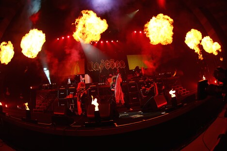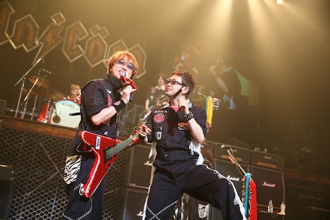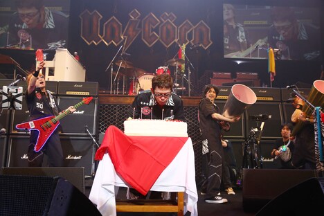 「もみじまんごじゅう」を締めくくるのはもちろんユニコーンだ。初日と同じように、まずは手島いさむ(G)、ABEDON(Key)、EBI(B)、川西幸一(Dr)の4人がそろいのつなぎに、ヘヴィメタル風の髪型でステージにスタンバイ。そして主役の奥田が登場すると、場内のテンションはいきなり最高潮に達した。5人はパイロや花火などの特効の演出とともに新曲「ロック!クロック!オクロック!」を披露し、「大迷惑」や「WAO!」といったライブの定番曲を畳み掛ける。奥田はステージをくまなく歩き回りファンサービスに応じるも、「もう大変っすね。コレ、祝ってもらってるんですかね? できれば部屋にいたい」と初日と同じようにぼやく。手島が「ダメです」と返すと、マイクを逆に持ち、客席に背を向け仁王立ちに。何が始まるのか観客がステージに注目する中で、スピーカーから聞こえてきたのは「届かない 身動きも出来ない」という「I’M A LOSER」の冒頭のフレーズ。会場が大きくざわめく中、奥田はマイクを持ち直すと往年のヒット曲を全力で歌い上げ、オーディエンスを驚喜させる。