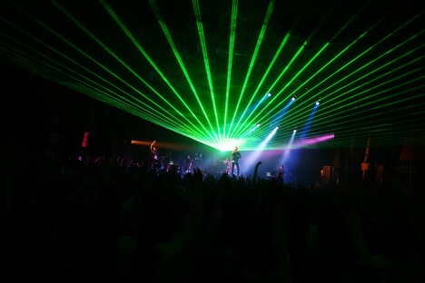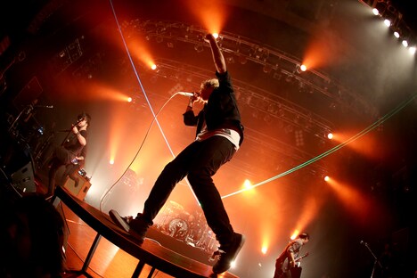 大歓声に迎えられたMY FIRST STORYは1曲目からレーザーを使った演出で観客を魅了。その中でフロントの4人がMasack(Dr)のキレのいいドラミングにあわせてジャンプを繰り返したりと、バンドは息の合ったプレイを見せていく。Hiro(Vo)はファンにシンガロングを託して「全然聞こえねえよ」と叫んだり、ステージの前方まで進んだりとしきりにファンを煽り、場内の温度をさらに引き上げた。さらに中盤には新曲(タイトル未定)も披露。シャウトの炸裂する激しいナンバーに、オーディエンスはモッシュやクラウドサーフで応えた。