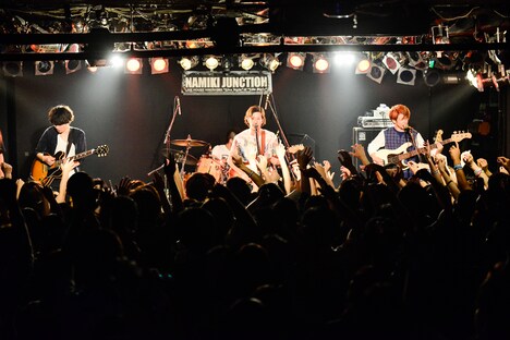 出演順をランダムに変えて行われる今ツアーでこの日トップを飾ったのはドラマチックアラスカ。彼らは序盤でソリッドなロックナンバーを連発して観客を刺激する。そして「世界の始まり」ではニシバタアツシ(Dr)が攻撃的なビートを、「打ち上げ花火」ではヒジカタナオト(Vo, G)とサポートのロマンチック☆安田(爆弾ジョニー)がツインギターで切ないメロディを届ける。終盤にはシングル曲「無理無理無理」が披露され、バンドは明滅するフラッシュライトの中で力強い演奏をフロアにぶつけた。
