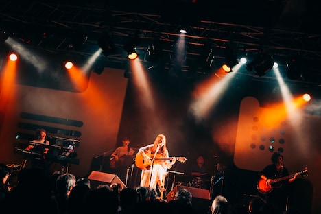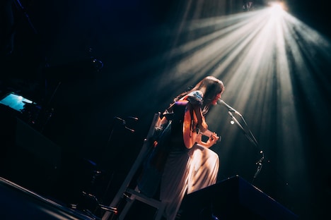メジャーデビュー後初のワンマンライブを地元福岡で行ったのち、この東京公演に臨んだ藤原。多くの観客が待ち焦がれる中、暗転と同時に彼女はバンドメンバーとともに姿を見せた。白いワンピースにカラフルなカーディガンを羽織った藤原は、ステージ中央に置かれたハイチェアに座り「ワン、ツー、スリー、フォー」と穏やかな声でカウントを取ると、アコースティックギターを爪弾きながら「Ellie」でライブをスタートさせた。