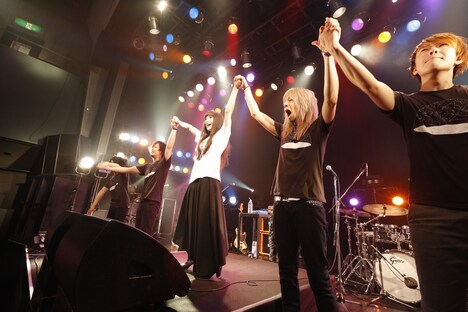 サビで盛大なファンのコーラスが巻き起こった「Happy☆Day」でライブは後半戦へ。こえだがsupercellボーカリストオーディションで披露したというボカロ曲「なないろの朝」では大人びた歌声で観客を魅了する。彼女の歌声はさらに熱を帯び、アップチューン「学校」で場内を温度を引き上げ本編を終えた。