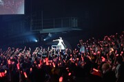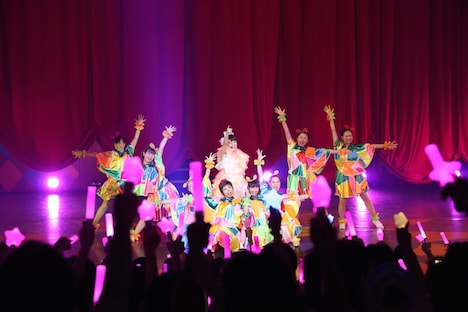その後も三森は“遊園地の支配人”にして、ミュージカル女優としてのキャリアもある彼女ならではの演出でステージを彩っていく。「せいいっぱい、つたえたい!」ではピンクの開襟シャツに白のロングスカートという50'sスタイルのダンサーとメリーゴーランドを楽しみ、雷鳴轟く中、始まった「Heart Collection」では、ゴシッキーなドレス姿に再々お色直し。なんとも不気味な洋館を映し出す透過型スクリーンの奥にしつらえられたアンティークチェアに腰掛けて、妖艶にこの曲を歌い上げる。さらにハードなEDMナンバー「Spinning Stars」ではステージ上空へとフライング。そのまま奈落へと降下していくと、今度は純白のドレス姿でせり上がり、星のように瞬く無数の電球に囲まれてラブバラード「ハーモニア」を優しく歌い、その目まぐるしくもドラマチックな演出でミモリアンたちの喝采を集めてみせた。