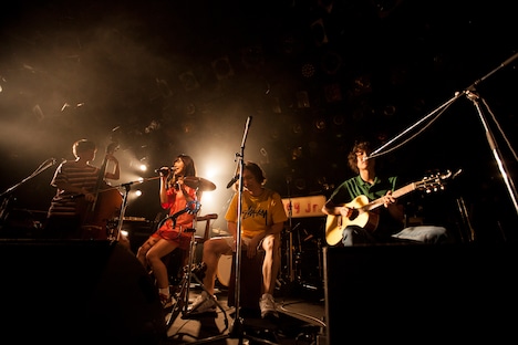 次にモリシー(G / Awesome City Club)やホーン隊4名も含めて「サンキュー」「おさんぽ」「baby I love you」と心地よいミドルテンポのナンバーが続く。ここでは池田と原田が息の合ったハーモニーでも魅せた。また中盤にはメンバー4人のみのアコースティックコーナーを設け、原田がアコースティックギター、森がウッドベース、諸石がカホン、池田がボーカルに加え小さな鉄琴を担当。バンド結成初期からある「やくそく」と「ばいばい」をしっとりと届けた。