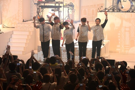 ステージに登場した後藤正文(Vo, G)、喜多建介(G, Vo)、山田貴洋(B, Vo)、伊地知潔(Dr)とサポートを務める下村亮介(Key, G / the chef cooks me)はそろいの衣装に身を包み、「Wonder Future」の楽曲を中心に次々と演奏を繰り広げる。その間、セットには歌詞の世界やサウンドの空気を表現したさまざまな映像がプロジェクションマッピングの技法を用いて映し出され、これまでの彼らのライブとはまったく異なる演出に客席からはさらなるどよめきと歓声が沸き起こった。