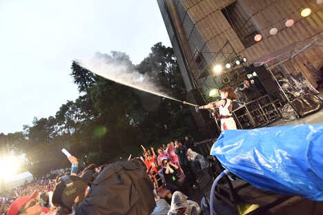熱のこもったライブを序盤から連発するアプガ。「魂を右の拳に込めて、私たちにぶつけてください!」と関根が叫び軽快なロックチューン「キラキラミライ」を投下したあとは、アプガのキュートな部分を堪能できる「バレバレI LOVE YOU」や「虹色モザイク」が届けられる。そしてライブも中盤に突入したところで7人は新曲「アッパーレー」を披露。歌唱前にメンバーが水鉄砲を使ってオーディエンスを濡らし始めるも、あまりのスケールの小ささに呆れた古川は「こんなのでビショビショになると思ってんの? もっと強いの持ってこーい!!」と叫ぶ。すると高圧力で水を噴射するウォーターガンが運び込まれ、会場全体に水を浴びせながらメンバーは同曲を熱唱した。雨が降らなくても結局ビショ濡れになったオーディエンスは「アッパーレー」のスカのリズムに体を揺れ動かし、テンションを上げる。さらに7人はファンが濡れたことなどお構いなしに続けて人気曲の「ジャンパー!」を投下。メンバーからの「跳べ!」という声に合わせておよそ3000人が一斉に大ジャンプを行い野音を大きく揺らした。中盤の締めにはおなじみの「チョッパー☆チョッパー」が歌い上げられ、ラストは佐保の渾身のチョップが野音で炸裂し、メンバーは一旦退場する。