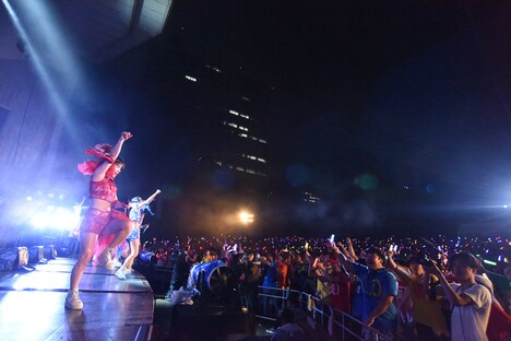 この日のライブのラストナンバーは「サマービーム!」。冒頭、佐藤の「そんなに暑いなら脱いでしまえー!」という言葉を受けてメンバーは上半身水着になり、水鉄砲を持って客席へとなだれ込む。さらに客席前方と中央に備えられたバブルマシーンから次々と泡が飛び出し、会場は泡まみれに。四方八方から水と泡が飛び交い、客席では水着姿のメンバーが走り回るという、まさに“お祭り騒ぎ状態”でライブはクライマックスを迎えた。