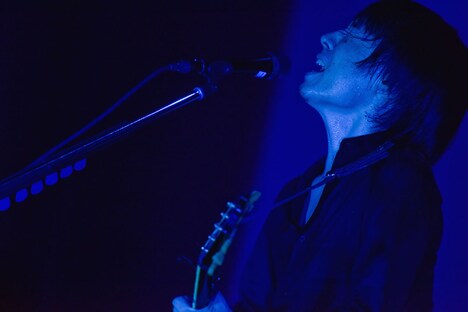 今回のツアーでは、最新作「Kranke」を携えて全国5都市を巡ったsyrup16g。定刻を迎えるとステージを覆っていた幕がゆっくりと開き、メンバーがスタンバイしている姿を認めるや否や待ち焦がれていたオーディエンスは大歓声をあげた。オープニングナンバーは「Kranke」の1曲目を飾る「冷たい掌」。ステージうしろのスクリーンには「Kranke」のジャケットに描かれている毒々しい色合いのビジュアルが投影され、その前で五十嵐隆(Vo, G)は骨太なバンドサウンドに気だるそうな歌声を絡ませる。1曲目が終わったところで彼は「ありがとう。こんばんはsyrup16gです」と落ち着いた声で挨拶し、「生きているよりマシさ」へとつなげた。その後も五十嵐が奏でるギターにキタダマキ(B)と中畑大樹(Dr)が丁寧に音を重ねた「To be honor」、万華鏡の中を映し出したような映像をバックにパフォーマンスされた「HELPLESS」と新旧の楽曲が続いた。