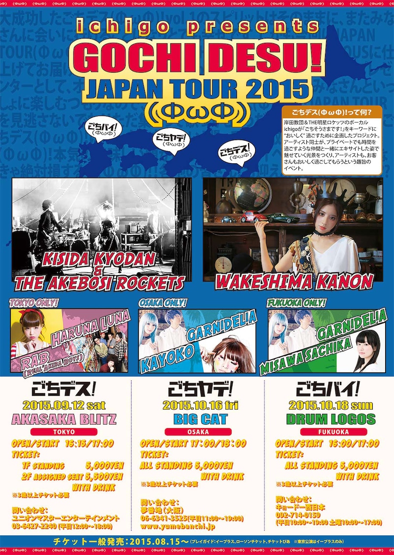 「ごちデス(ФωФ)!」は“ごちそうさまです!”をキーワードに、“おいしく”過ごせるライブを目指すichigoのプロジェクト。9月12日の東京・赤坂BLITZ公演を「ごちデス(ФωФ)!」、10月16日の大阪・BIGCAT公演を「ごちヤデ(ФωФ)!」、10月18日の福岡・DRUM LOGOS公演を「ごちバイ(ФωФ)!」と銘打ち、岸田教団&THE明星ロケッツとして各地でバンドゆかりのゲストと競演する。