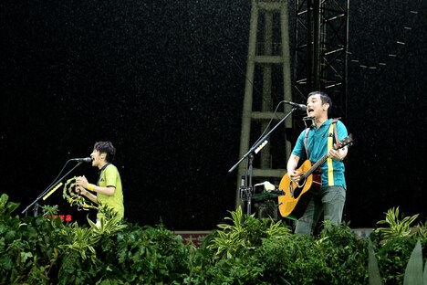 初日と同じくマーチングバンドが「夏色」を奏でる中、ライブタイトルにちなんだ二人三脚で北川悠仁と岩沢厚治がステージに現れる。この日の1曲目は「センチメンタル」。さわやかなメロディと2人の歌声がスタジアムに響き渡ったのち、2曲目の「ところで」の途中で雨が降り始めた。雨足が徐々に強まる中、ここ横浜での路上時代からの名曲が次々と披露される。「心の音」の「今にもひと雨来そうな真っ黒な雲が西から流れ始めた」というタイムリーな歌詞には客席から思わず笑い声が起こるが、時に優しく時に力強く歌う2人の声に、次第に全員が聴き入っていった。