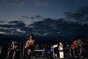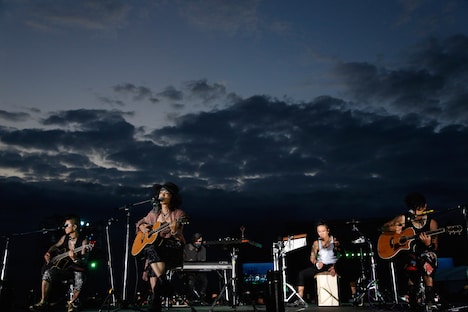 「BEAST PARTY」では毎回アコースティックスタイルでカバー曲を披露しているVAMPS。今年は、HYDEとJINの2人による演奏でバラード調にアレンジしたJITTERIN'JINN「夏祭り」が届けられ、しっとりしたアンサンブルが海辺に艶のあるムードを生み出す。さらにK.A.Z、Ju-ken、Arimatsuの3人も合流し、パフォーマンスを繰り広げる。「僕な好きな人が好きだった曲を」というHYDEの紹介から披露された「evergreen」、Arimatsuの叩くカホンによって軽やかなアレンジに仕上がった「THE JOLLY ROGER」と続く。HYDEが小さな鐘を鳴らしながらゆったりと歌い上げた「MY FIRST LAST」では炎の演出も相まって幽玄な空気が会場を包み込んだ。なおこのブロックでは、メンバー1人ひとりが夏にまつわるトークを展開。それぞれ幼少時代の思い出を中心に語り観客を楽しませた。