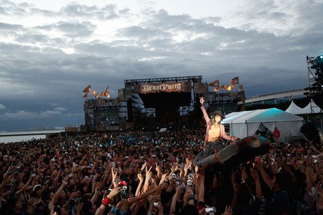 「天気いいなあ」と空を見上げたHYDEは「本当にストレスがないね」と口にすると、「SEASON'S CALL」でスケール感のあるサウンドを描き出す。そしてK.A.Zが焦らすようなギタープレイで観客の興奮を高めた「I GOTTA KICK START NOW」、HYDEが「全部出して、あとは俺に任せろ! 全力でいこうぜ」と満面の笑みで言い放って歌い出した「HELLO」を経て、Arimatsuのドラムソロに突入。彼はQueen「We Will Rock You」やVAMPSの楽曲のトラックに乗せて力強いドラミングを披露し、後半戦への期待を煽っていく。ドラムソロが終わったタイミングで、HYDEがゴムボートに乗り込み、観客の手を借りながら客席エリア内に作られたセンターステージに移動した。