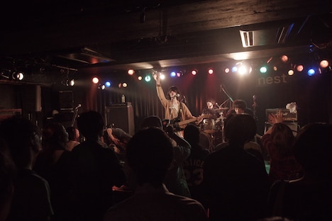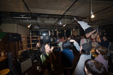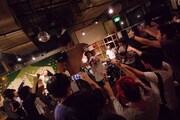 Helsinki Lambda Clubの演奏が終わると、ラウンジフロアでエンディングアクトのMANGA SHOCKのライブが始まる。ラウンジフロアを通過していく観客たちを見た平島圭祐 a.k.a ひらっち(Vo)は「早く! 早く! お客さん帰っちゃうから!」とメンバーに声をかけ、彼らは「NOIZE~KILL ME MY BABY~」でライブを始めた。ひらっちを筆頭にメンバーは続々と観客の間へと突入し、フロア中を巻き込んでいく。彼らはテーブルやカウンターに飛び乗ったり、天井のパイプにぶらさがったりと好き放題に暴れ回り、フロアは大混乱の状態に。MANGA SHOCKは30分間で全18曲を演奏し、大盛り上がりのうちにイベントを終了させた。