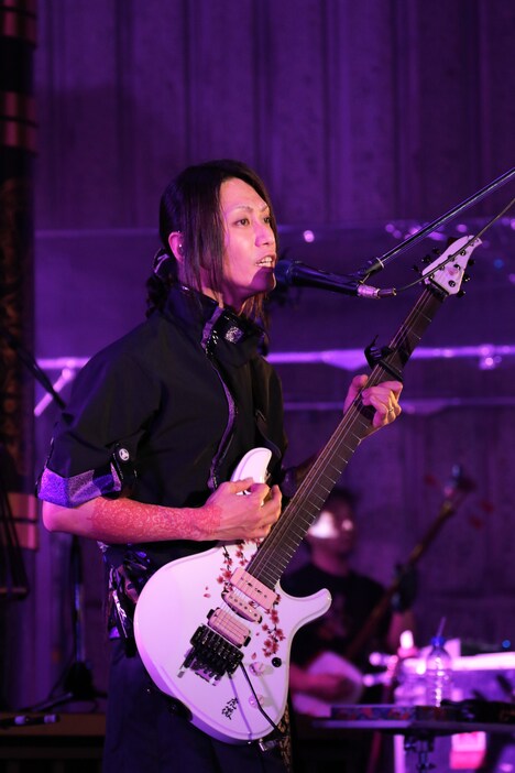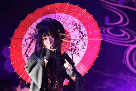 開演時間を迎え、明滅するライトを浴びながらステージ後列にいぶくろ聖志(箏)、山葵(Dr)、黒流(和太鼓)が、前列に鈴華ゆう子(Vo)、亜沙(B)、神永大輔(尺八)、町屋(G)、蜷川べに(津軽三味線)が登場。バンドは歓声を上げるオーディエンスに向かってまずアグレッシブなロックチューン「戦-ikusa-」をぶつける。楽曲に合わせて黒流が掛け声を発すると、オーディエンスも「オイ! オイ!」と声を上げて紫色の光を放つペンライトを振った。