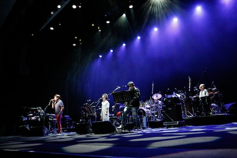 大きな月をバックに披露された「月への階段」の曲中にはストリングスとピアノが掛け合い、壮大なアンサンブルを生み出した。続く最新シングル曲「Longing ~雨のRegret~」では夕陽に包まれるような照明の中、佐藤が温かくもエモーショナルな歌声を場内に響かせる。その後演奏された「Your Love」「点し火のように」の曲間には塩谷が指揮をとり、ストリングスセクションのみで緩急のある演奏が届けられ、オーディエンスを釘付けにした。「後半戦! 楽しんでください!」という佐藤の声を合図に届けられたのは「It’s City Life」。西村智彦(G)のギターカッティング、露崎が奏でるグロッケン、大儀見のパーカッションプレイが軽やかに楽曲を彩る。本編最後の「Maybe」では佐藤と露崎が向き合って男女混声のソウルフルな歌声を披露し、場内から拍手喝采を浴びた。