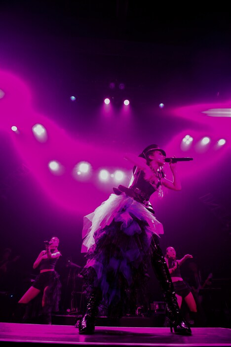 ギター、ベース、ドラム、バイオリンからなるサポートバンドメンバーとともに、フルハウスの豊洲PITにまず登場したのはtoku(Key, G)。オープニングSEに乗ってギターを手にステージ下手のお立ち台に仁王立ちした彼は、強烈なフィードバックノイズとともに「21248913」のイントロを奏でながらメイリア(Vo)をステージへと迎え入れる。その後彼らは勢いそのままに、8月リリースのインディーズベスト盤収録の「Arrow of Love」や「COLOR」、2014年1月のプレデビュー曲「True High」など、初期のロックチューンを畳みかけた。