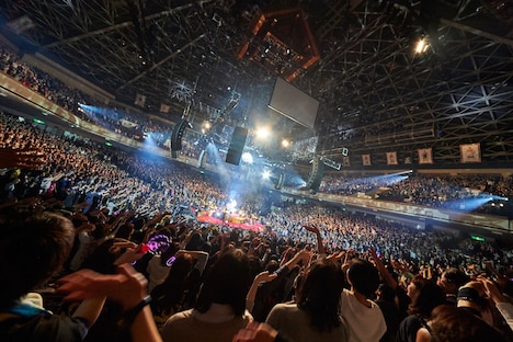 1月11日に実施される沖縄公演まで、全国で11公演が開催される今回のツアー。この日の会場である両国国技館の入り口には「レキシさん江 紫式部」「レキシさん江 聖徳太子」「レキシさん江 ザビエル」と、そうそうたる歴史上の人物からレキシへ贈られたのぼりが立ち並び、来場者の期待感を煽った。開演時刻を少し過ぎた頃におなじみのほら貝の音色が舞台の幕開けを告げると、向正面の通路の奥から駕籠を担いだ4人の男衆が現れ、国技館の中央に設けられたステージへ。彼らが舞台上に置いた駕籠にスポットライトが当たると中からレキシが勢いよく登場し、彼は「国技館、行くよー!」と元気に叫んだ。