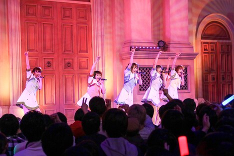 ステージ奥の大扉から登場した6人は、教会広場でのイベントに憧れていたと言う澁谷が「泣いちゃいそう」と感激したかと思えば、直後に芹澤が、空を模した天井の色が自身のイメージカラーと同じ青に変化したのに気付いて「私、空に推されてるー!」と笑う、にぎやかなMCを挟みつつイベントをスタート。ラインダンスで魅せる「ドリームパレード」と、テクノポップテイストの「i☆Doloid」で広場いっぱいにあふれるハンドクラップやペンライトの光を集めてみせた。
