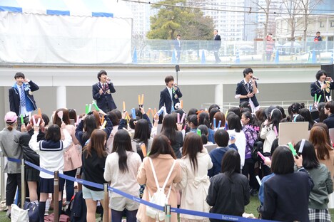 オープニングSEが鳴ると5人は駆け足で登場。ステージに上がった彼らは、デビュー曲「コーヒーが飲めません」でミニライブをスタートさせる。曲を終えると吉田仁人は「今日3月30日、僕たちのニューシングルがリリースされました!」とファンに報告し、好天の下に大きな歓声が響いた。