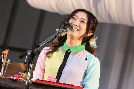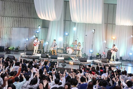 5人はこの日だけのスペシャルバージョンだという色とりどりの衣装に身を包み登場。いちろー(Vo, G)が煽ると入場のSEにあわせて発生していた観客のハンドクラップはいっそう大きくなり、場内は大きな期待感に包まれる。そしていちろーが「OK、始めます!」と声をあげ、バンドは色鮮やかな照明に照らされる中「カラフルカラフル」で軽快にライブをスタートさせた。5人は佐藤全部(B)とかみむー氏(Dr)の刻む安定感のあるリズムに乗せて分厚いコーラスを響かせ、場内をハッピーな空間にする。さらに疾走感あふれる「少女ジャンプ」「シンクロする」を続け、観客のテンションを引き上げていった。