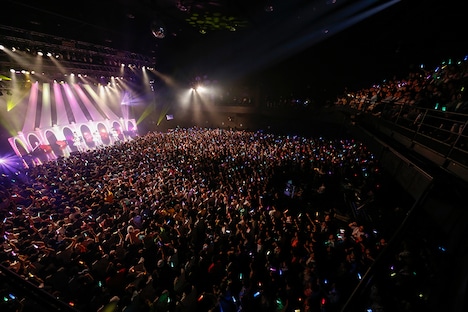 超満員2700人のオーディエンスであふれかえるZepp Tokyoに登場したi☆Risのこの日のいでたちは、タキシード風ドレス。そのクールなスタイリングに歓声が上がると、彼女たちは「ドリームパレード」「ブライトファンタジー」「§Rainbow」と自身のシングル曲にして、彼女たちが声優を務めるアニメ「プリパラ」シリーズの歴代テーマソングを立て続けにパフォーマンスして、ライブ序盤からフロアを盛り上げる。