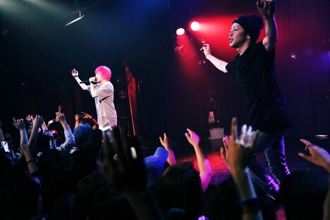 「Mis(ter)Understand」ののちにはデジタル感の強いハードなトラックに乗せてnicecreamがバックダンサーたちと共にダンス。キレのあるブレイクダンスでフロアを盛り上げると、対するハシシは「INVADER」で、巨大フラッグを手にオーディエンスをアジテートする。またこの曲で彼は、ゲストラッパー・RAqと共に息つく間もないフロウを繰り広げ、会場の熱気をピークへと押し上げた。