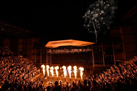 アンコールはドラマチックな展開に。ステージの奥に広がる草むらがキャンドルアートでライトアップされる中、2人がドラマチックなバラード「翼」をパフォーマンスすると、ラブバラード「愛すること」では無数の打ち上げ花火が夜空に咲き誇る。そして打ち上がり続ける花火を背に「シドニア」との連作的な1曲「騎士行進曲」でぢぇらっ子たちを大いに“アゲて”、再びステージをあとにした。