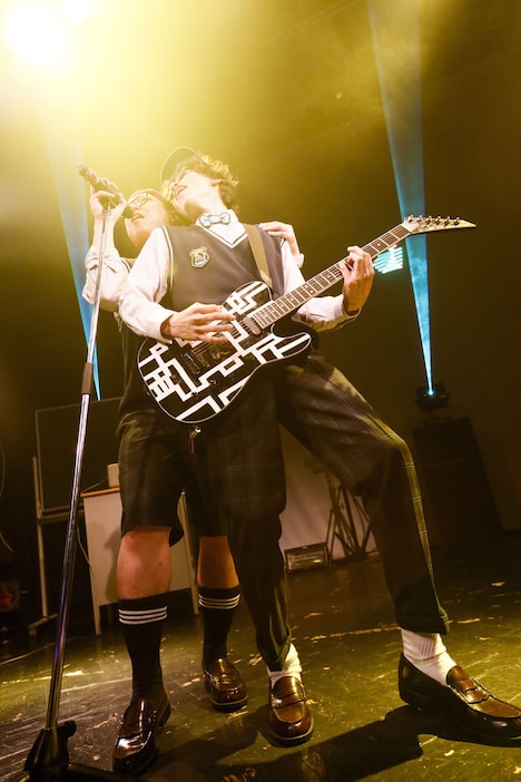 サブタイトル通り、ライブは“ボーイフレンド就任記念式典”からスタート。ステージには赤じゅうたんが敷かれ、竹内サティフォ(Vo, G, Programming)と斉藤伸也(Vo, GAYA, Programming)が順番に姿を現すと場内には「“ボーイフレンド就任記念式典”のオープンです!」というアナウンスが。その声に続き2人は紅白テープにハサミを入れ、式典という名のライブをスタートさせた。