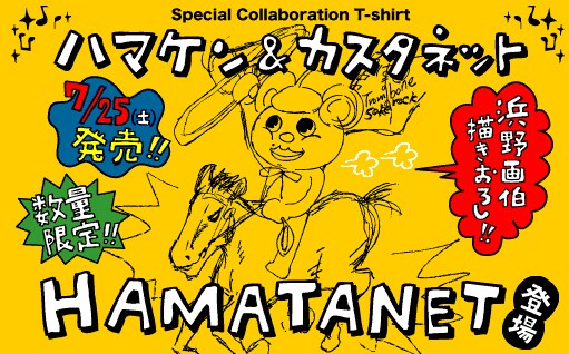 Tシャツのデザインは、ハマケンの直筆イラストがモチーフ。ハマケンはカスタネットのキャラクター、カスタネットちゃんと自分の姿を重ね合わせた、奇妙なタッチのイラストを描き下ろしている。